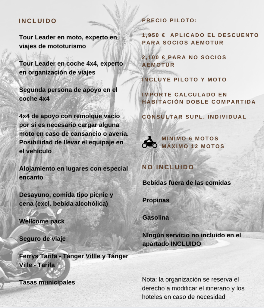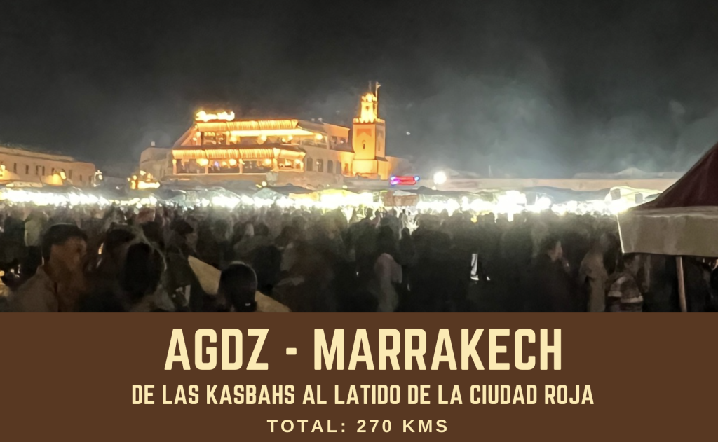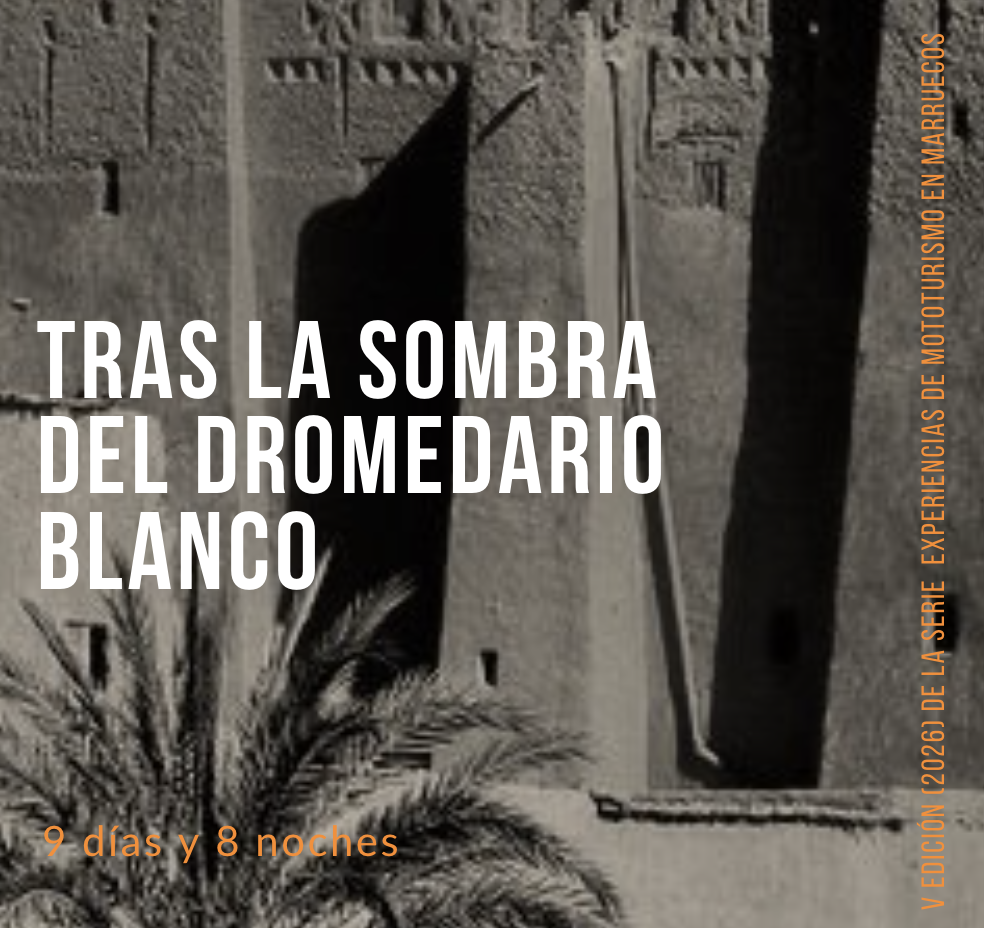 «Tras la Sombra del Dromedario Blanco” es una experiencia de mototurismo de aventura diseñada para recorrer el sur más auténtico y desértico de Marruecos, un territorio donde la historia y la naturaleza se entrelazan. Un viaje que comienza en las bulliciosas calles de Nador y nos lleva hasta los confines del Sahara, para después ascender las montañas del Atlas y terminar en el latido vibrante de Marrakech.